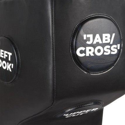 Objetivos de Golpe: La figura presenta 6 objetivos de golpe elevados para practicar los diferentes golpes del boxeo. Identificados con su nombre, fomentan la correcta ejecución de las combinaciones y la coordinación auditiva-visual.